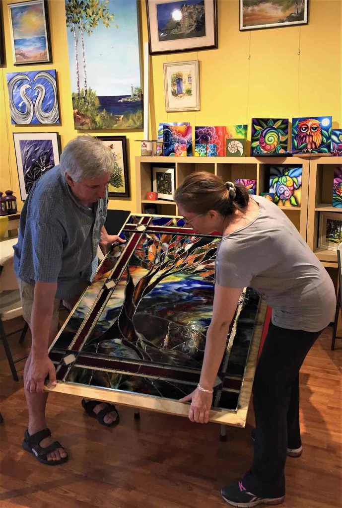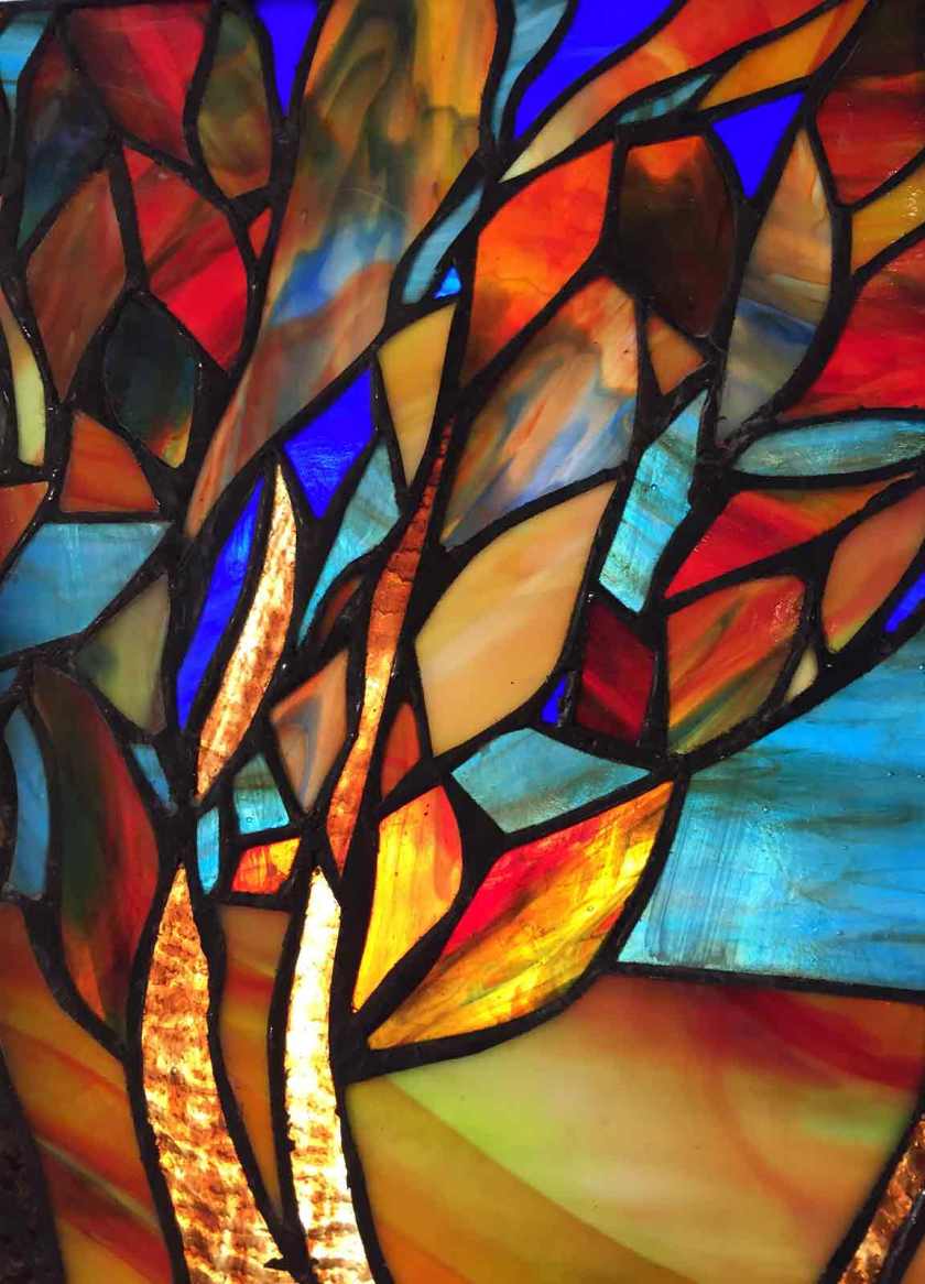 Doug and Jodi had a real need to blot out the view of a neighbors HVAC unit, and turned to stained glass for their picture window. The other artwork in the room and their love for a 100-year old oak tree in their front yard set the theme. And, with Jodi’s affinity for color in her decor, it was a lot of fun choosing material – vibrant and rich! Check out the image of the perfect sheet of art glass from Kokomo Opalescent Glass! Who wouldn’t be inpired!