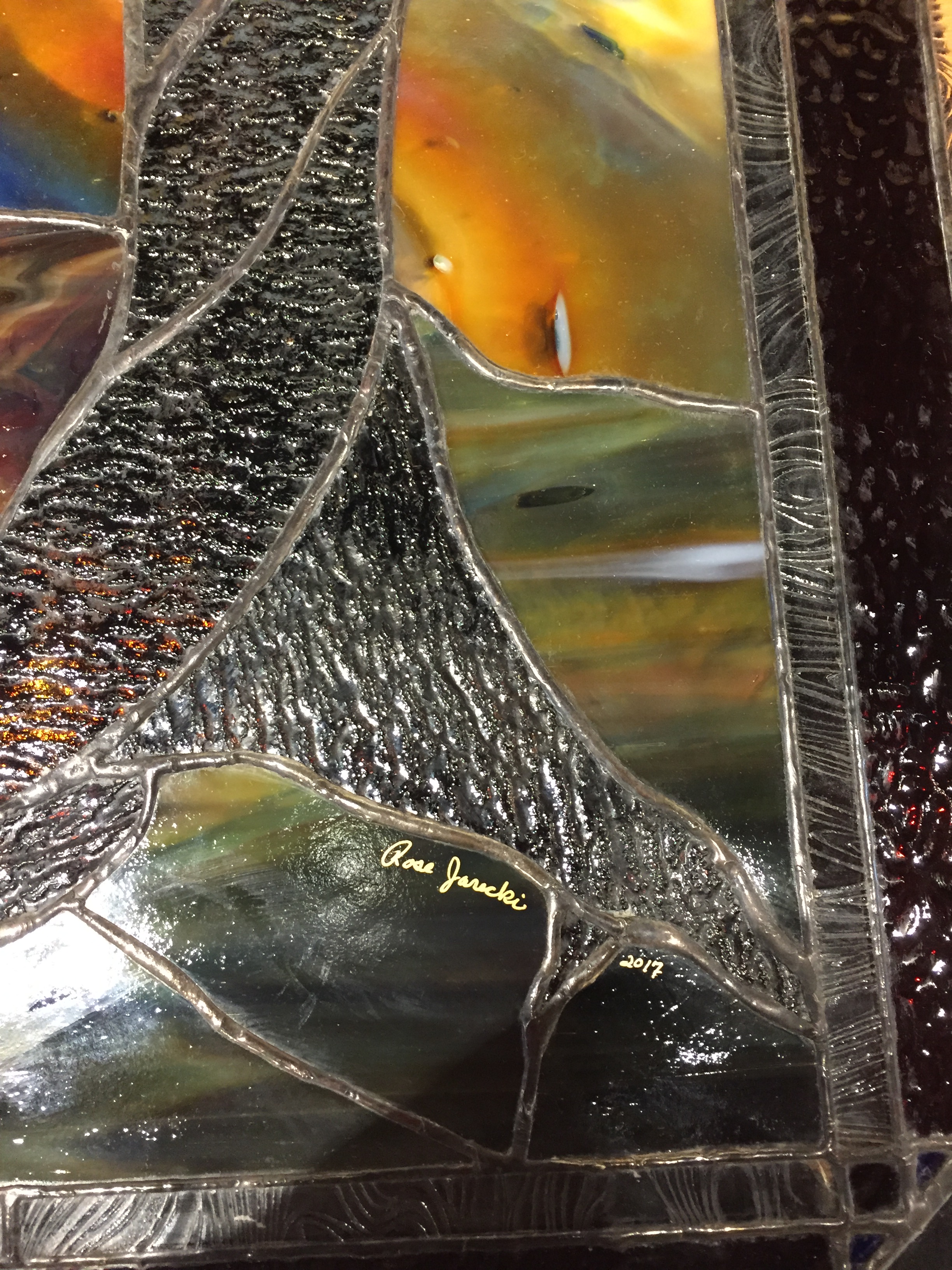 Now the trick was to use this glass strategically to fit in with the art. A detailed hand drawn original was created and then the hours of work delicately cutting apart (“gasp”) this beautiful sheet and re-configuring it to tell the story.