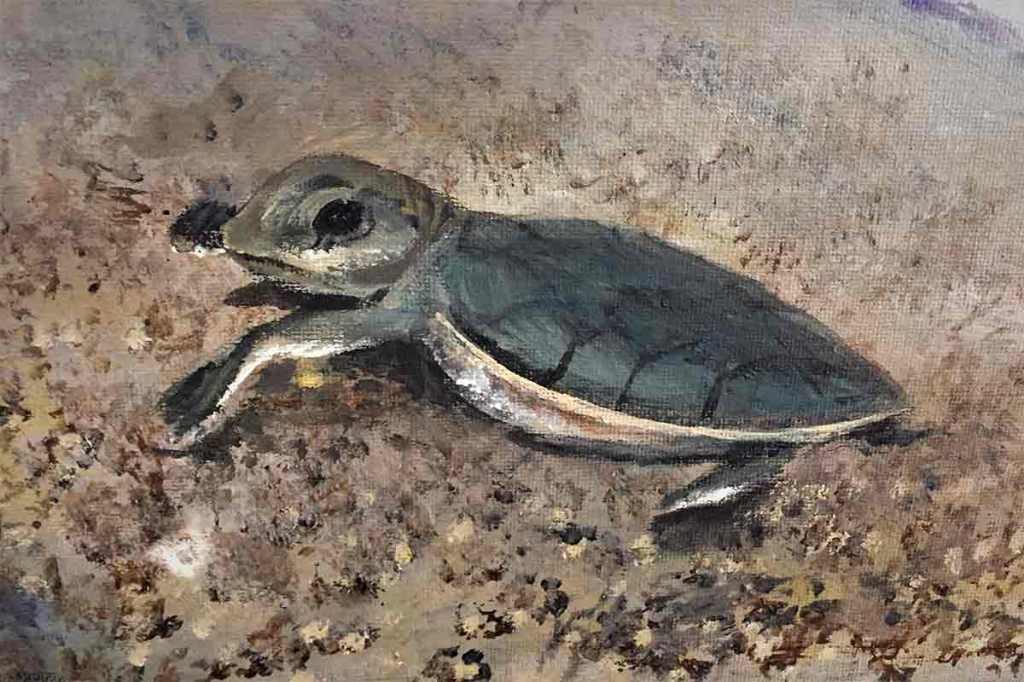 Inspired by the acrylic painting class with one of my younger students who brought this subject to class for us to explore, this little sea turtle worked up so cute. As he sat on the easel, every time I passed him, I couldn’t help but look into the face of this creation – the angle of the head seeming to look up at me and ask, “Which way to the sea?” I almost found myself reaching for him, wanting to pick him up and put him into the water, where he could continue his journey.