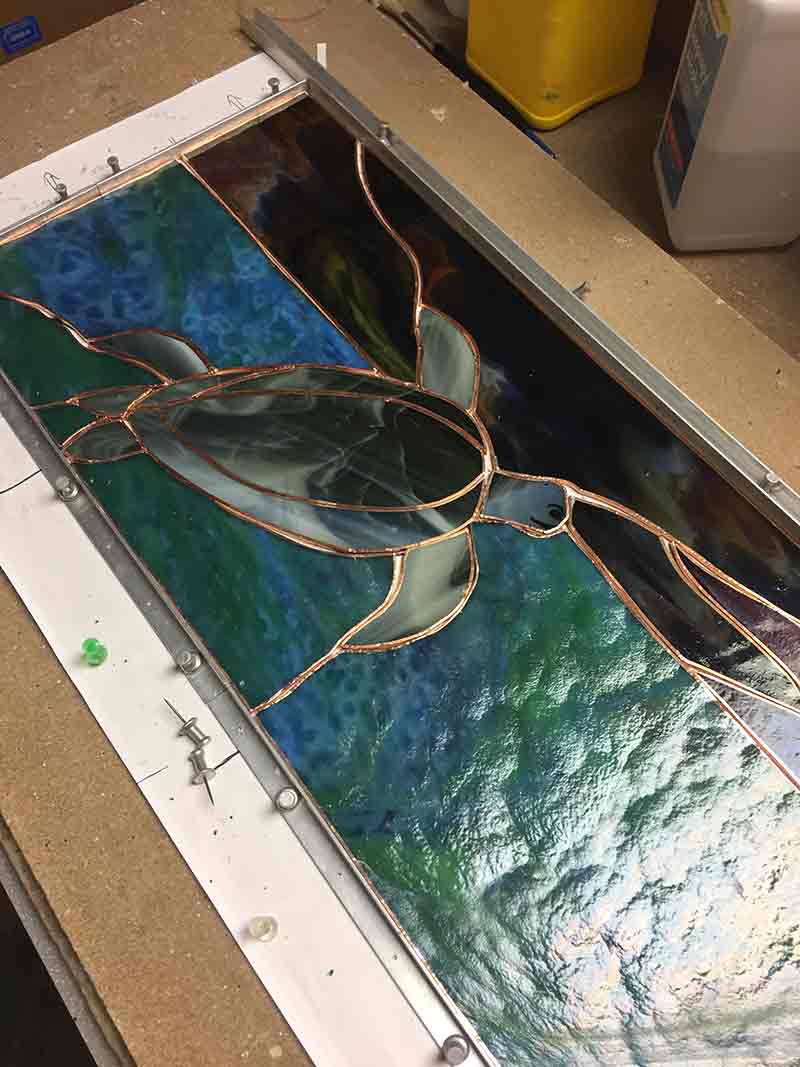 These are some of the first looks at the dramatic stained glass designs as they are lifted from the board to flip the work over for further soldering. As we view the piece for the first time with transmitted light, we can finally see the luminance the art glass offers, and experience the contrast of lights and darks.
