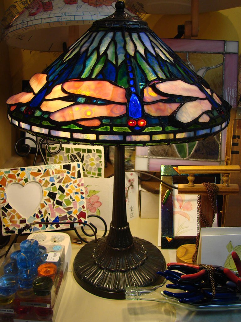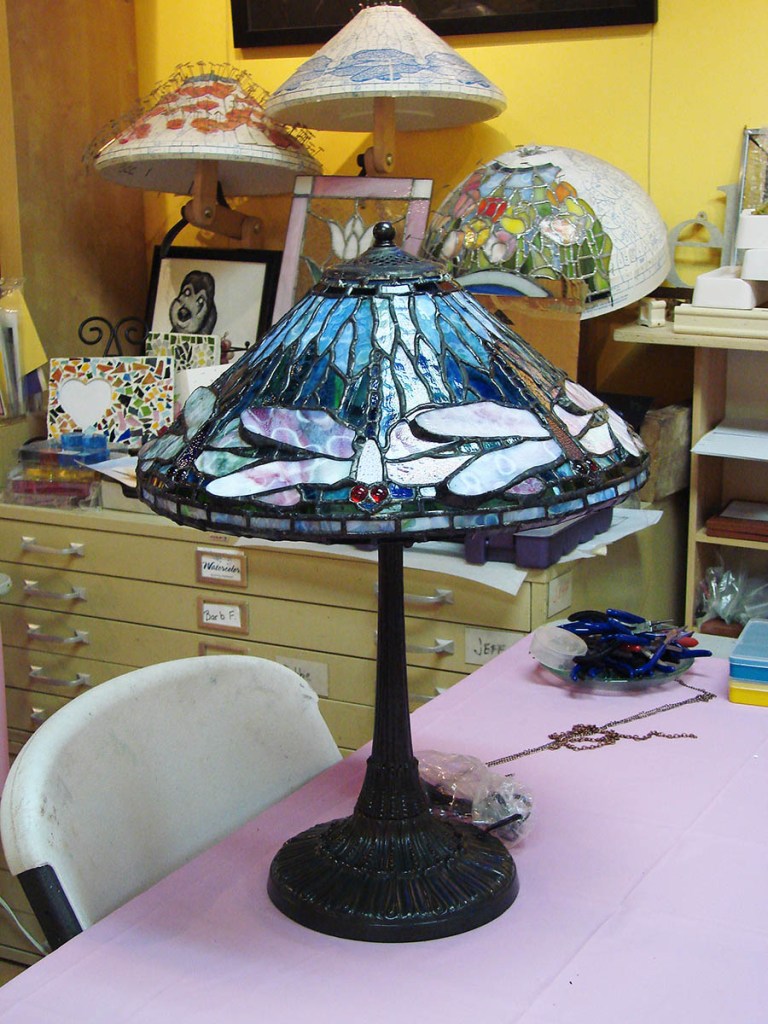 Paying homage to American stained glass artist Louis Comfort Tiffany, student work from Gallery’s Choice stained glass lamp class has tremendous results. The marathon of stained glass projects, these lamps are not exceedingly difficult, but take time and patience!