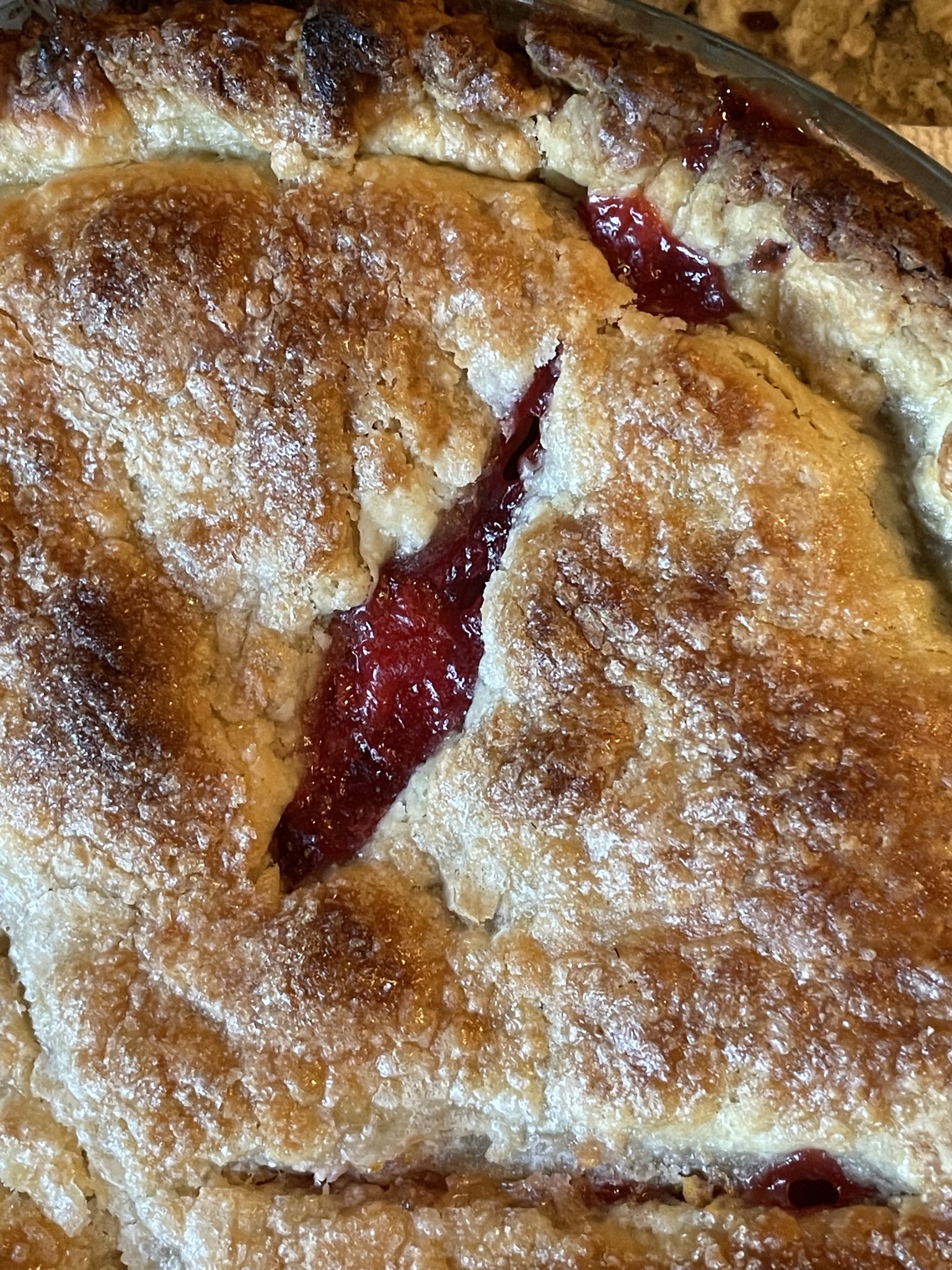 Stunning pie crust! When we were kids my Mom was “trying to make a pie crust with little success got mad and threw the pie crust against the wall…where it stayed for a while!!!